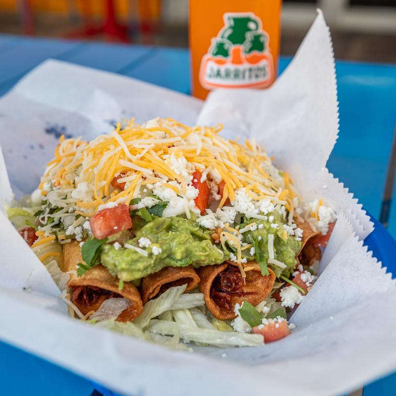 4 chicken fried flauta. Topped with guac, lettuce, tomato, sour cream & queso fresco.